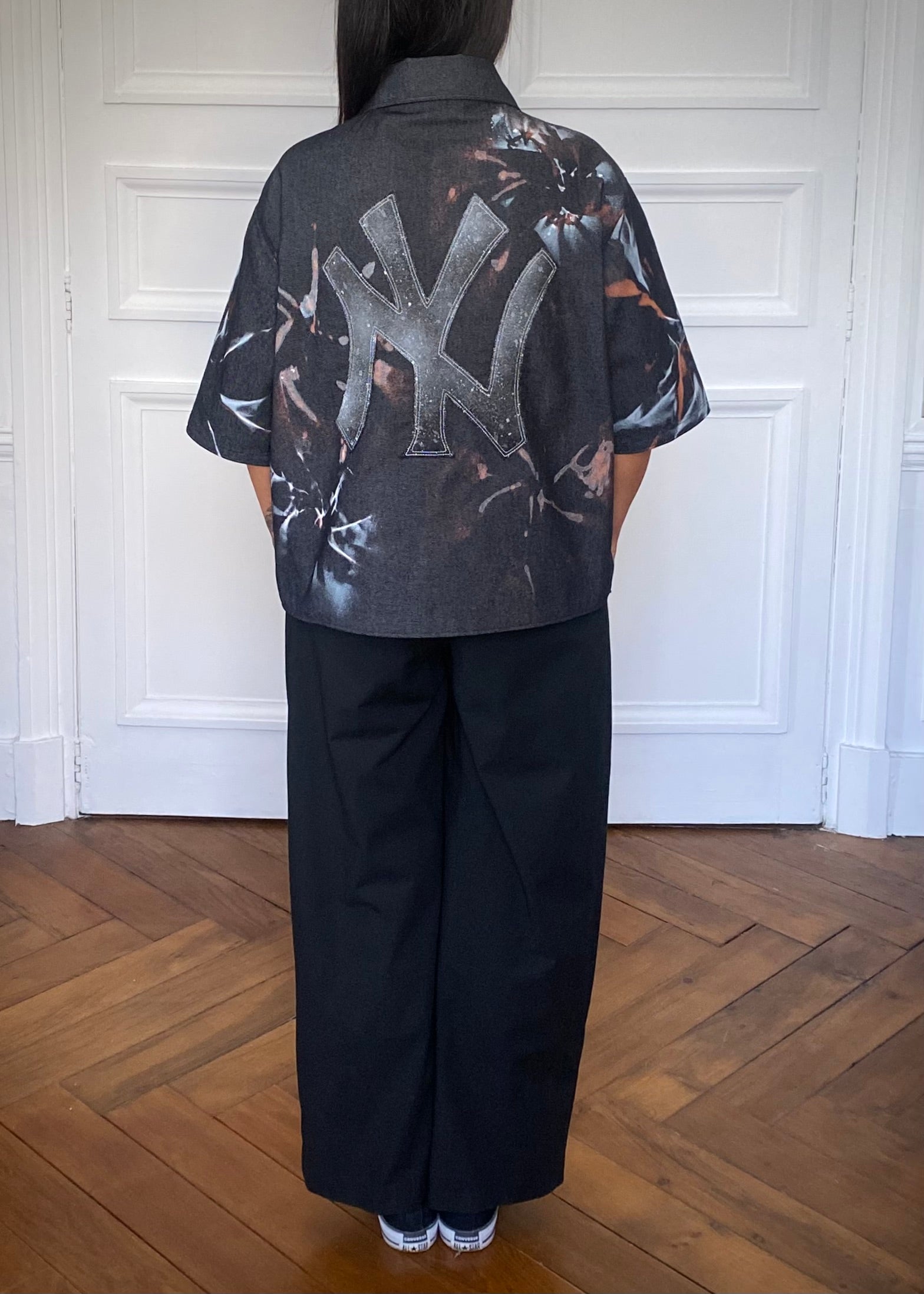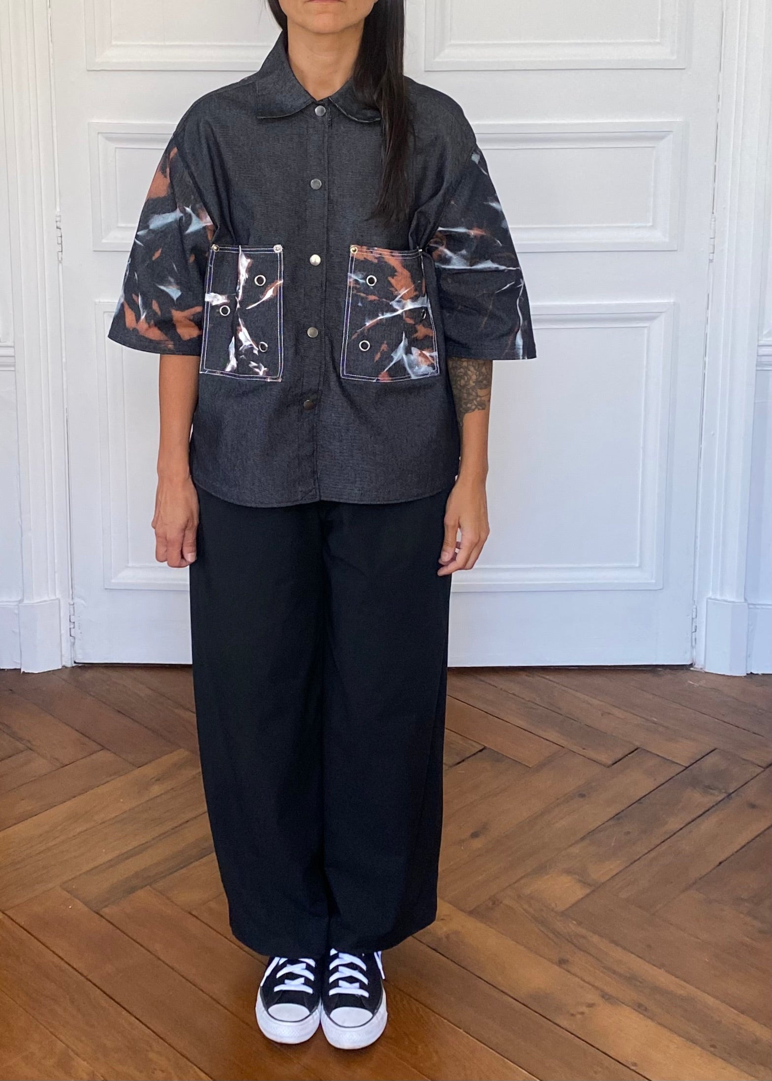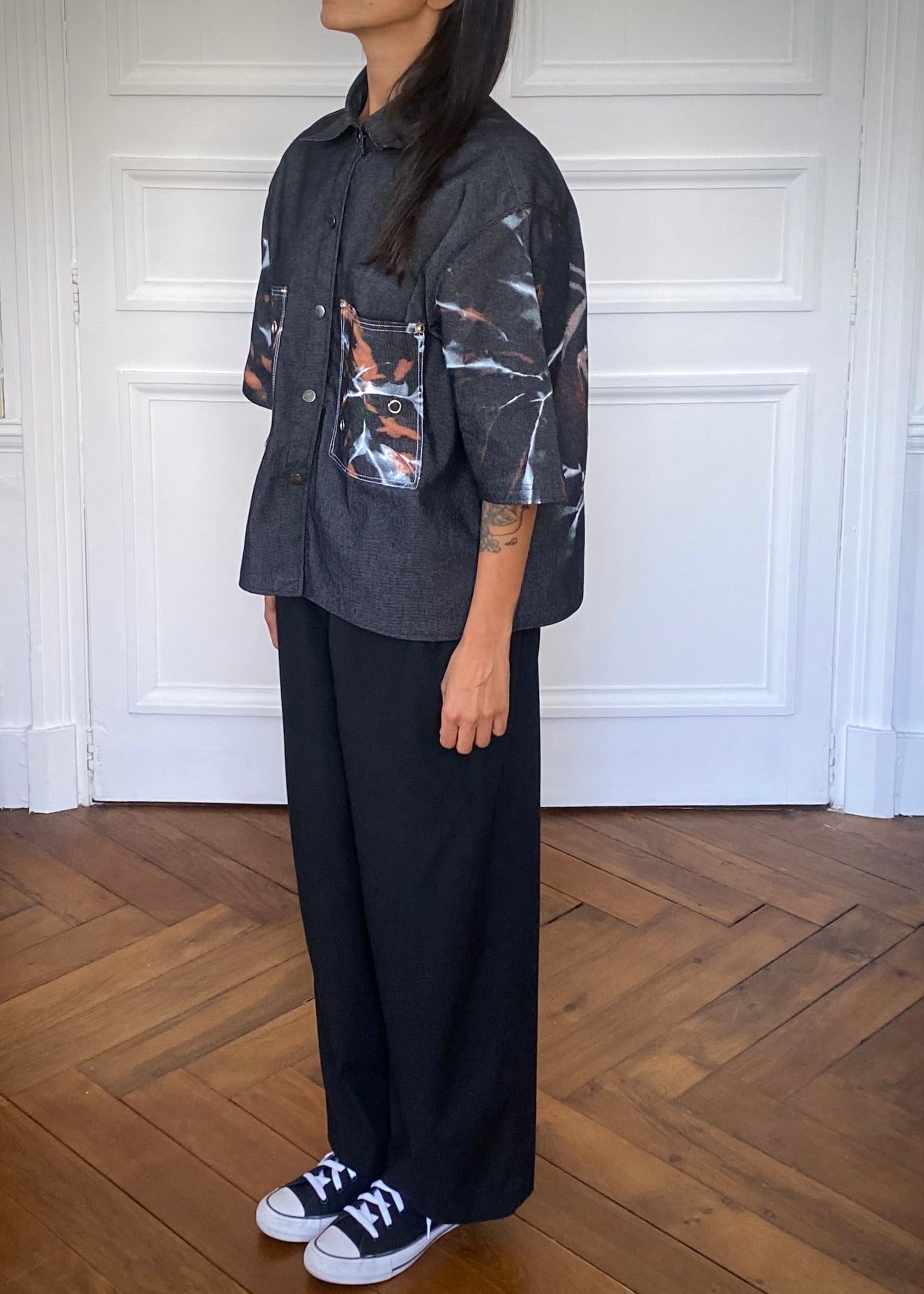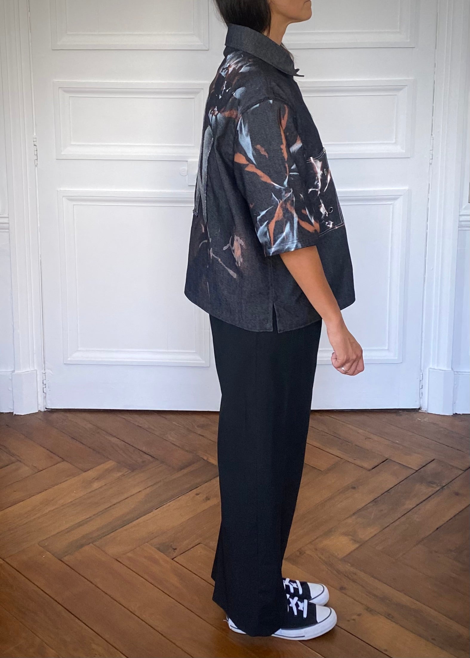 Description : La jacket coupe boxy confère une silhouette moderne et unisexe, idéale pour superposer ou affirmer un look oversize maîtrisé. Deux poches plaquées, fentes sur les cotés, empiècement dos, boutons pressions, les motifs sont réalisés à la main avec des peintures textiles.